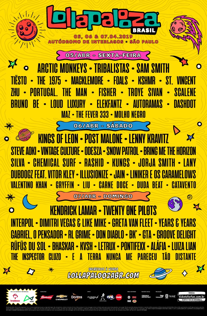 Além das novidades, o festival anunciou quais serão as apresentações dos três dias, separadamente. Arctic Monkeys, Tribalistas e Sam Smith ficam no dia de abertura, Kings of Leon, Post Malone e Lenny Kravitz no segundo e Kendrick Lamar e twenty one pilots fecham.
