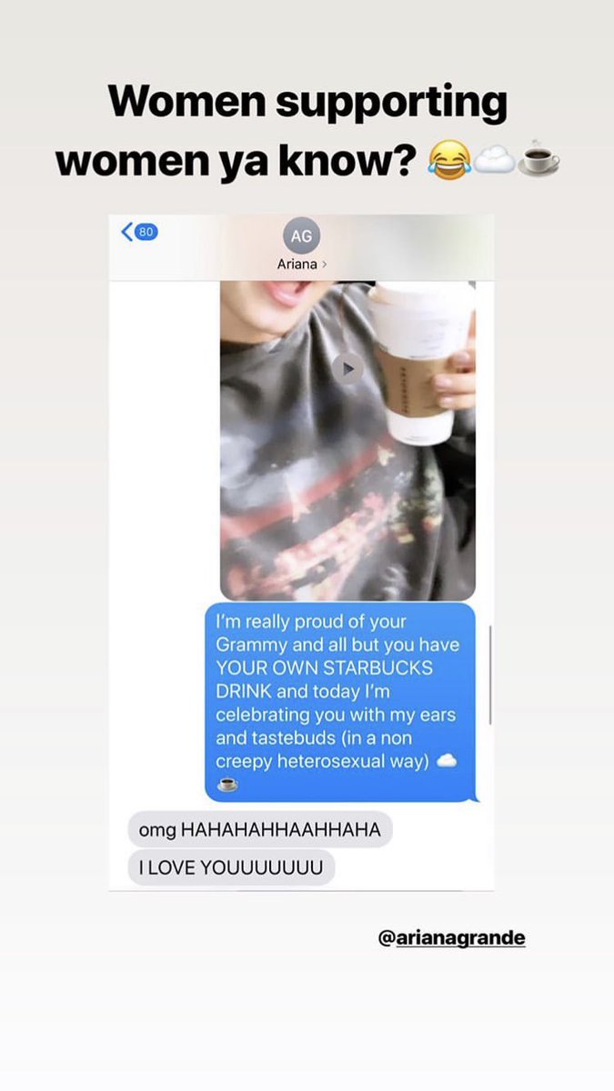 A prova veio ontem (6), quando a intérprete de “Into You” publicou no stories do Instagram um print de uma conversa que as duas estavam tendo. No trecho, Lovato comenta sobre o Grammy de Grande e envia uma foto bebendo a nova bebida do Starbucks em parceria com Ari, chamada “Cloud Macchiato”.